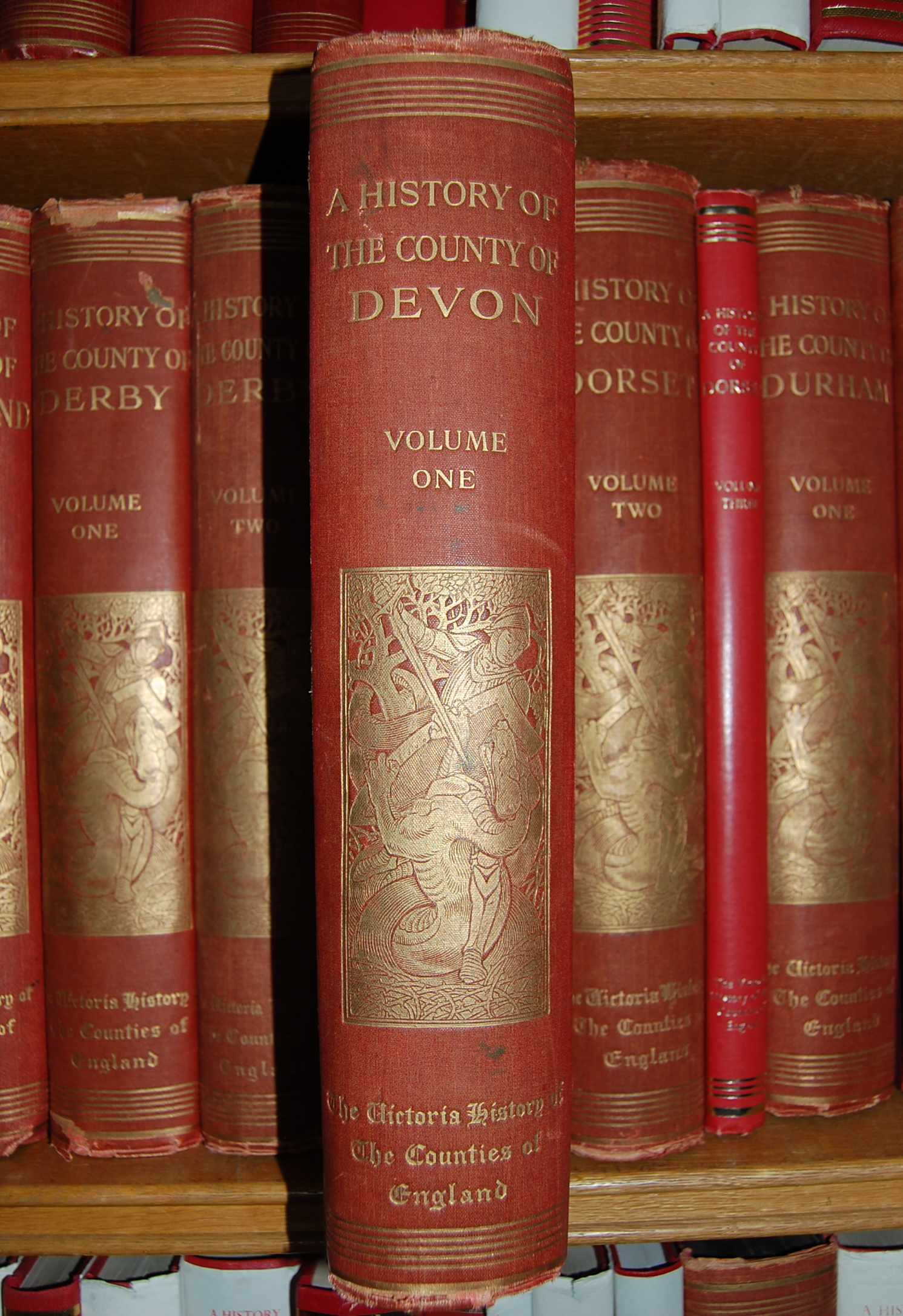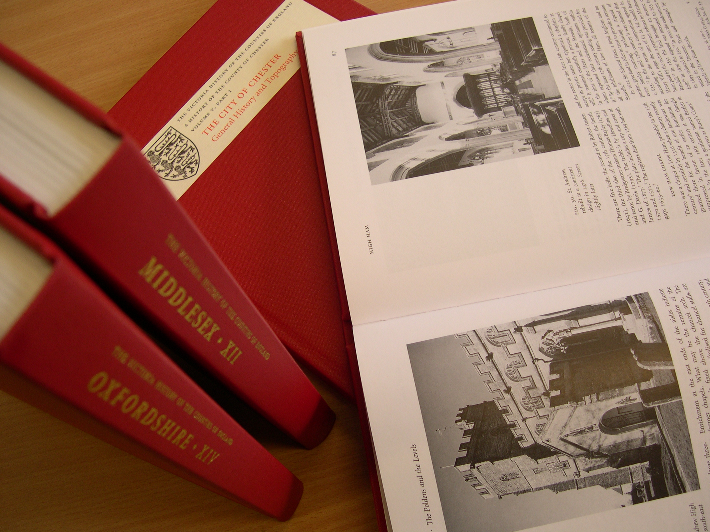 our new home on the Mezzanine. What, I think, has struck me most, whilst rifling through archive boxes and revisiting volumes on the shelf, is just how incredibly beautiful these books are. The early volumes such as Devon I (pub. 1906) contain illuminations and artwork on the spine; a level of artistic detail so rarely seen these days. The modern volumes such as Middlesex 13 (pub. 2009) have an unfussy, ‘crispness’ of design. Both are aesthetically pleasing in their different styles and reflect the evolving design of VCH volumes. Perhaps one day all red books will be available as downloads. Whilst we seek to embrace such innovations I do hope that future VCH Publications Managers will look after these handsome yet ever-delicate tomes and ensure their unique place in the Institute’s collection.
