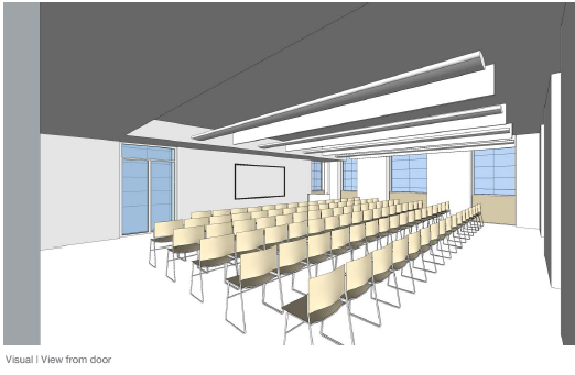 So here is the proposed conference suite. As you can see there are two rooms (one with a capacity for about 90 and the other for about 40). However, just like the old Wolfson and Pollard rooms, these can be joined together to form one larger suite (see images below). Of course, this poses difficulties of design to make sure that everyone can see the speaker and large screen projected image. Much thought, therefore has been put into that issue to avoid any problems. The suite will also be fitted with entirely new state-of-the-art AV (audio-visual) equipment including plasma screens, projectors, speakers and microphones. We have several design drawings for the conference rooms which can be looked at below: