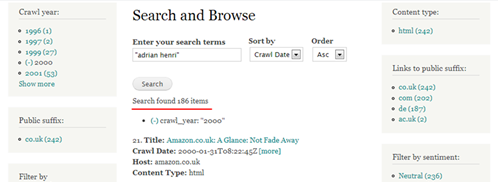 (4) http://www.webarchive.org.uk/aadda-discovery/browse?text=%22adrian+henri%22&sort_by=solr_document&sort_order=ASC (5) http://www.webarchive.org.uk/aadda-discovery/browse?text=%22adrian%20henri%22&sort_by=solr_document&sort_order=ASC&f[0]=crawl_year%3A%222000%22