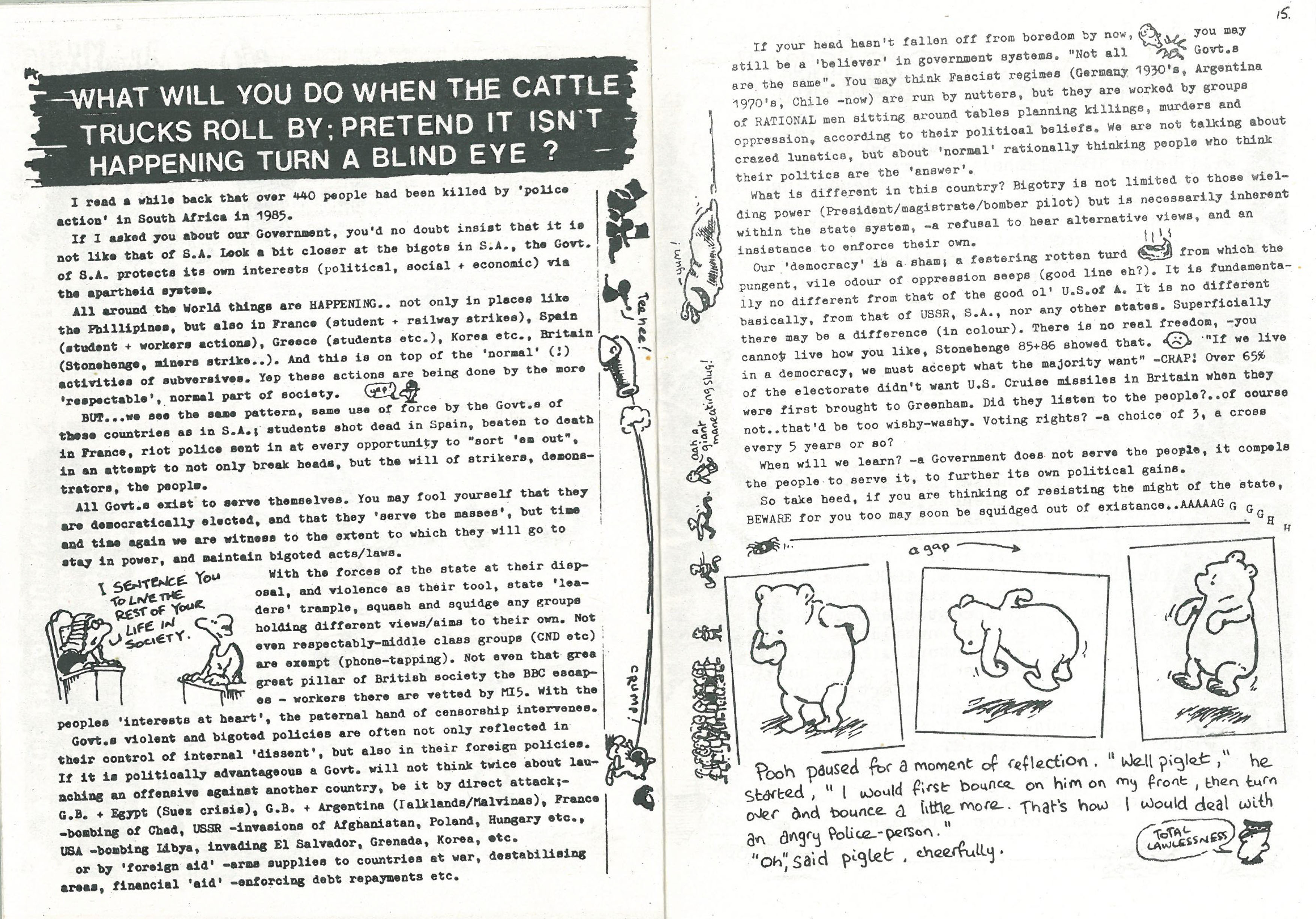 I was involved in many group actions and political action/campaign groups in Swansea. We hosted punk gigs as benefit fund raisers for causes like Rape Crisis Centre and the striking miners etc. We had Chumbawamba play a few times, back when they released their critique of Live-Aid/charity ‘Pictures of Starving Children sell records’ LP. They’d all sleep on our bedroom floor after the gig. We played in our own (punk) bands too. Producing Bigot was another output for my political ideas and a step in my own social development. It was perhaps a way for me to re-enforce my own beliefs too, and for me to address my own controlling tendencies. I was involved in making another political paper at the time called Swansea Black Sheep, with two other student anarchists. It was a great paper but I felt like I had to compromise a little doing that, so I wanted to put produce something that was solely my own editorial, hence Bigot. It probably played some cathartic role. I sold it at punk gigs around the country and in the local community bookshop (called “Emma’s”, named after anarcho feminist Emma Goldman). I went on to be involved in other political (anarchist) national papers for years afterwards until about 1996.