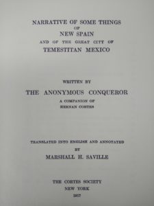 The document was written during the early 16th century by an unknown author referred to as a “companion of Hernán Cortés”, or simply, “The Anonymous Conqueror” or “Gentleman of Cortés”. The edition in the IHR Library’s collection was translated into English by Marshall H. Saville, and published by the Cortés Society in New York in 1917. The document is one of the sources for the Spanish conquest of the Aztec Empire dating from the 16th century, one of the many surviving contemporary Spanish accounts from the period of the Spanish conquest of the Aztec Empire and central Mexico (1519–1521). However, unlike conqueror accounts which highlight individual deeds worthy of rewards from the Spanish crown (a genre called probanzas or relaciones de méritos y servicios,[1] , the Anonymous Conqueror’s account is descriptive of indigenous life at the time of the conquest.