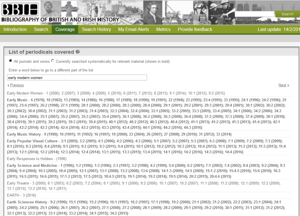 If you have access to the online Bibliography, you can also see journal coverage by selecting “Coverage” from the main menu on the search page, and then selecting the “Currently searched systematically for relevant material” radio button. Note that items from journals or series that we have decided to cover only recently may not be included in the published Bibliography yet.