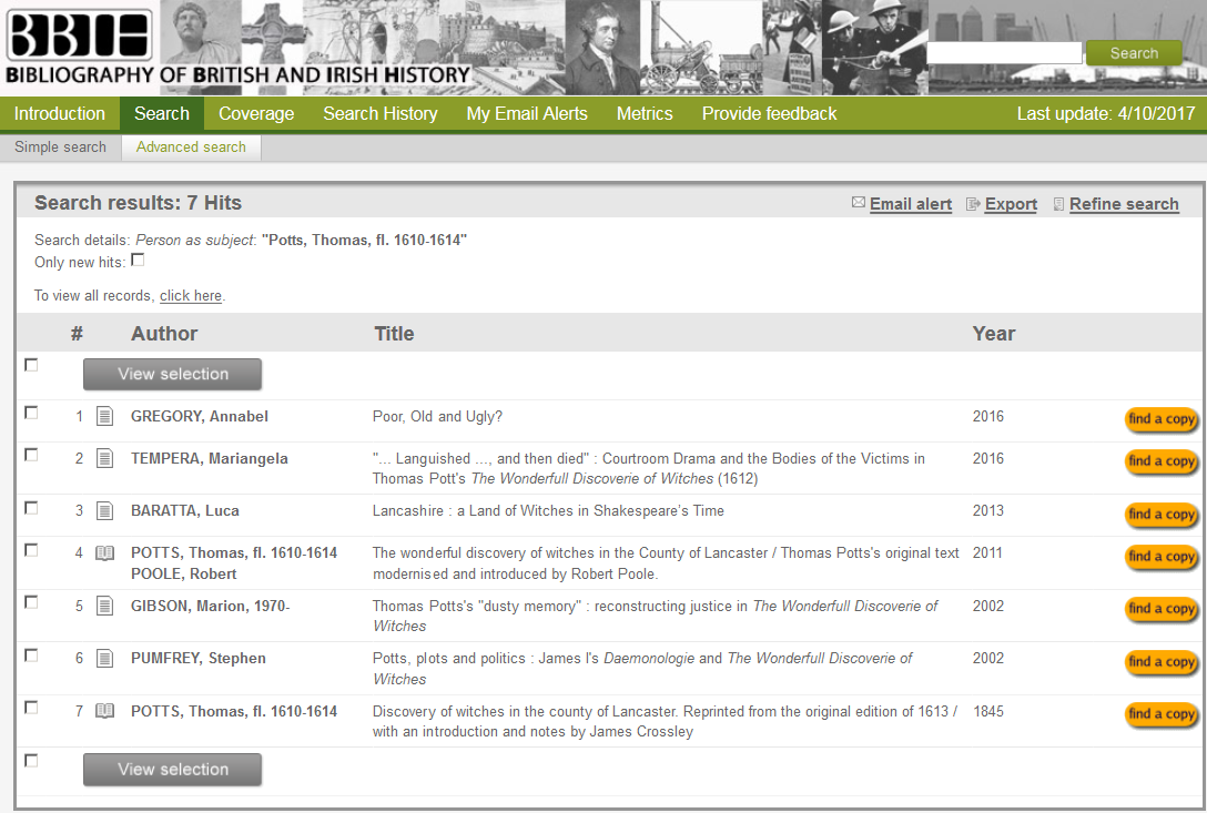 Of course there is much on witches and witchcraft trails, and specific places can be searched for, such as the witches of Pendle Forest as well as the clerk of the court who recorded the proceedings, Thomas Potts.