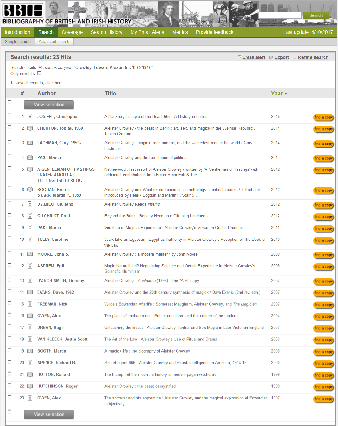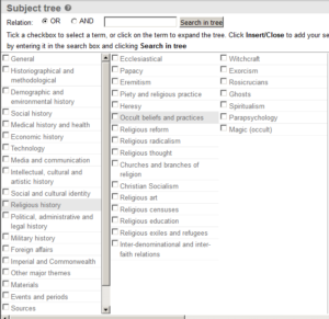 Naturally BBIH has lots of material on the occult. The snapshot from the subject tree shows the range of search terms that can be used.
