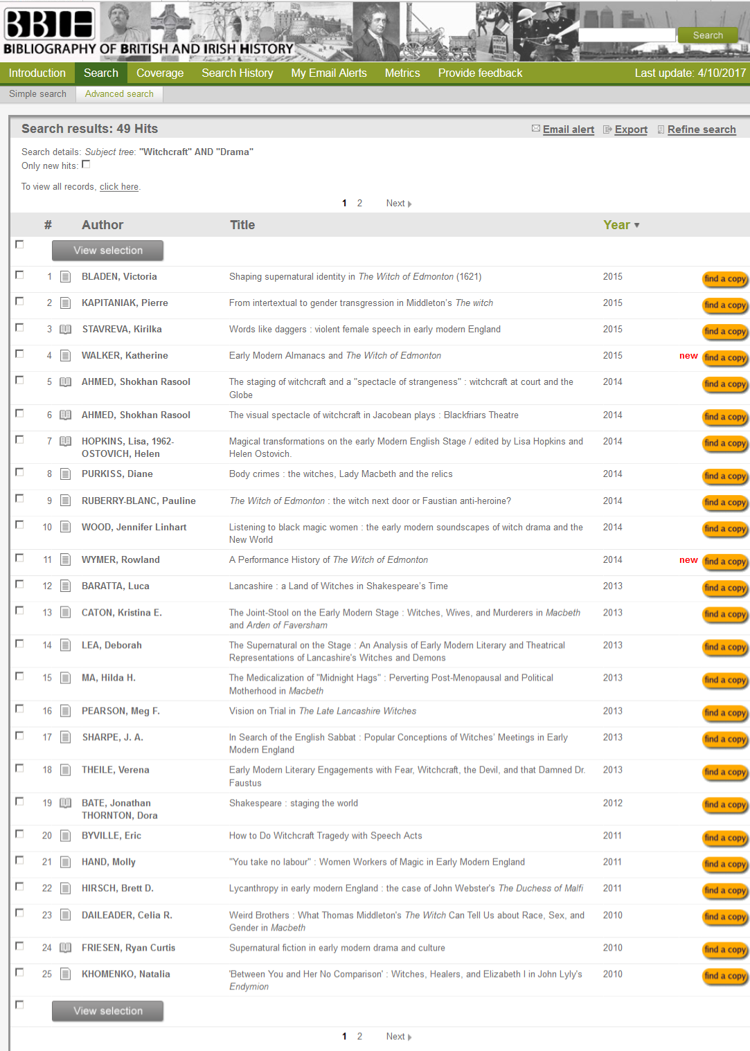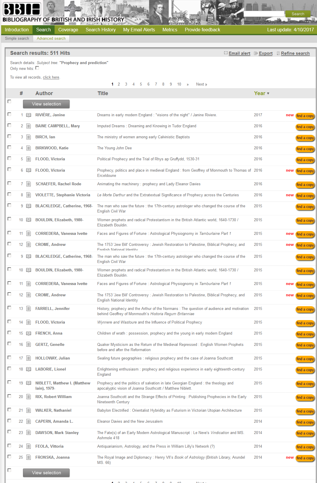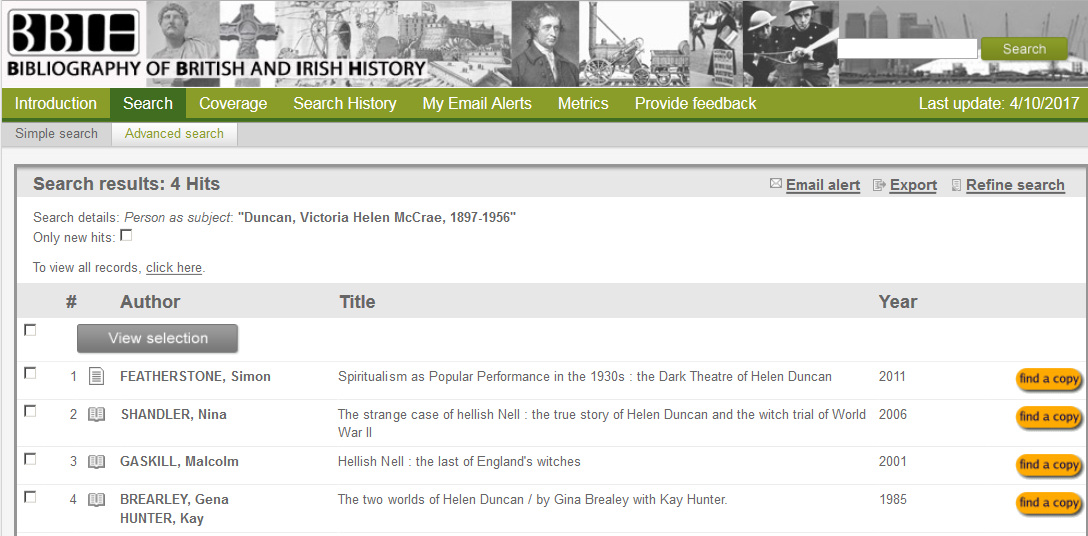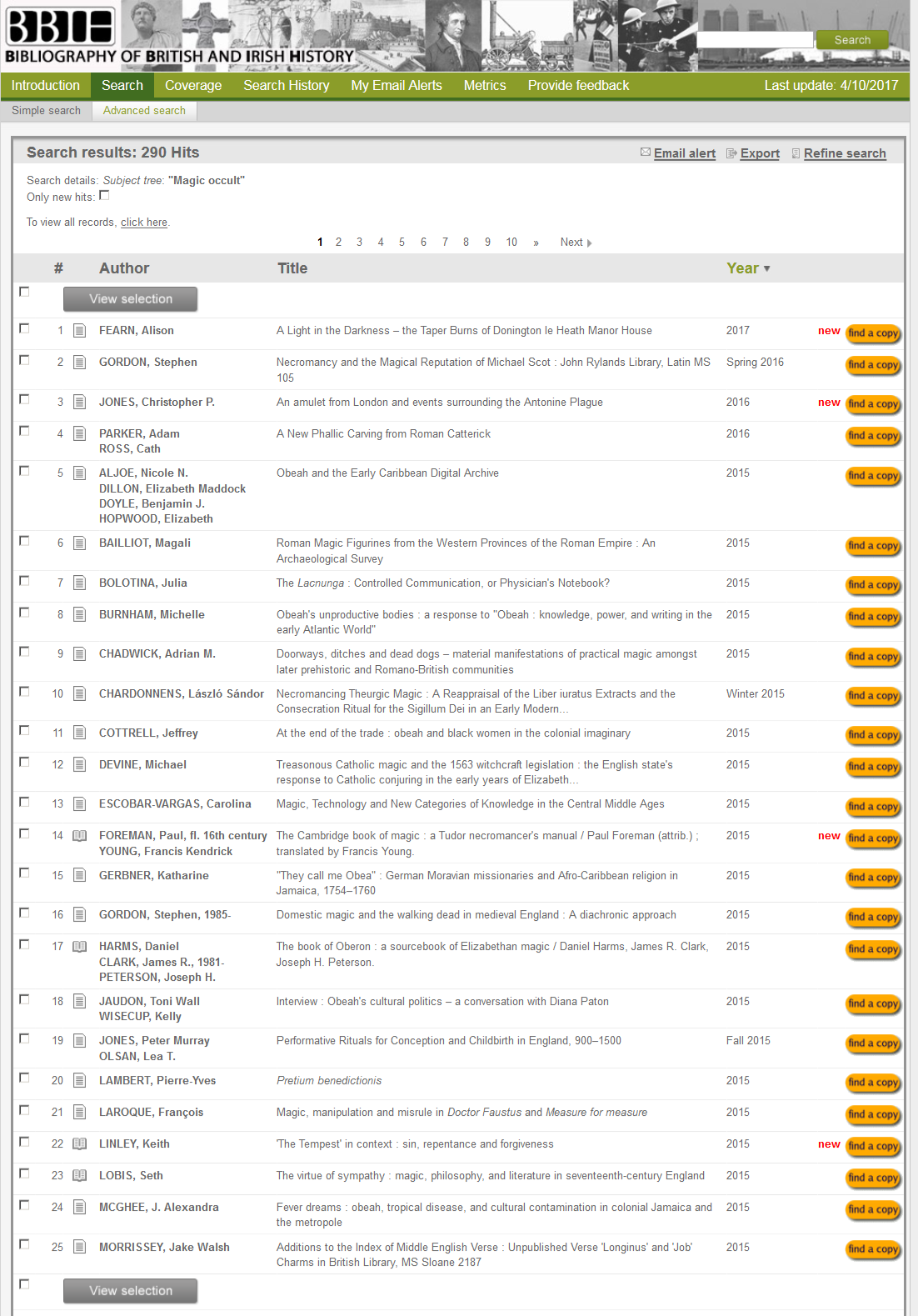 A search on the broader term Occult beliefs and practices brings up over 1500 entries including witchcraft trails, the devil in post-Reformation Scotland and British Intelligence and the occult in the Second World War.