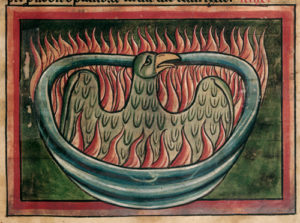 Detail of a miniature of a phoenix burning, Harley 4751 f. 45 British Library