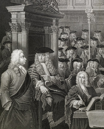 The print (1730) shows the ‘Great Speaker’ Onslow in the chair (centre), calling prime minister Walpole at his elbow (left) to speak, before a packed House of Commons. [National Trust number = 1441463]